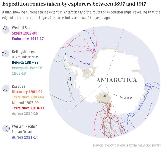 Quando a extensão atual do gelo do mar na Antártica é sobreposta sobre as rotas passadas dos navios da expedição, revela que o gelo no continente gelado é na maior parte o mesmo agora como era no início do século XX.