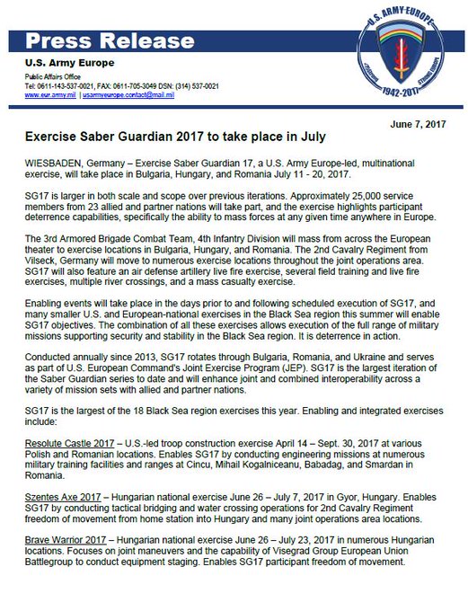 As maiores manobras lideradas pelos EUA na área do Mar Negro neste ano verão 25 mil soldados americanos e aliados reunidos na Bulgária, Hungria e Romênia neste julho para os exercícios anuais "Saber Guardian 2017".