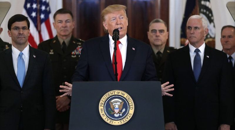 O presidente dos EUA, Donald Trump, observou na quarta-feira, 8 de janeiro, que os ataques com mísseis do Irã naquela manhã em duas bases americanas no Iraque não causaram perda de vidas americanas ou iraquianas e danos mínimos. "O Irã parece estar desistindo", disse ele em um discurso à nação. Se o Irã mudar de comportamento e abandonar o terrorismo e a destruição, dos quais Qassem Soleimani foi o arquiteto, "avaliaremos nossas opções", disse ele. Teerã deve entender que um acordo tornará o mundo um lugar melhor e trará prosperidade ao próprio Irã. "Todos devemos trabalhar para um acordo melhor com o Irã", afirmou ele. Enquanto isso, Trump anunciou novas sanções econômicas à República Islâmica e reiterou: “Nunca deixaremos o Irã adquirir uma arma nuclear.